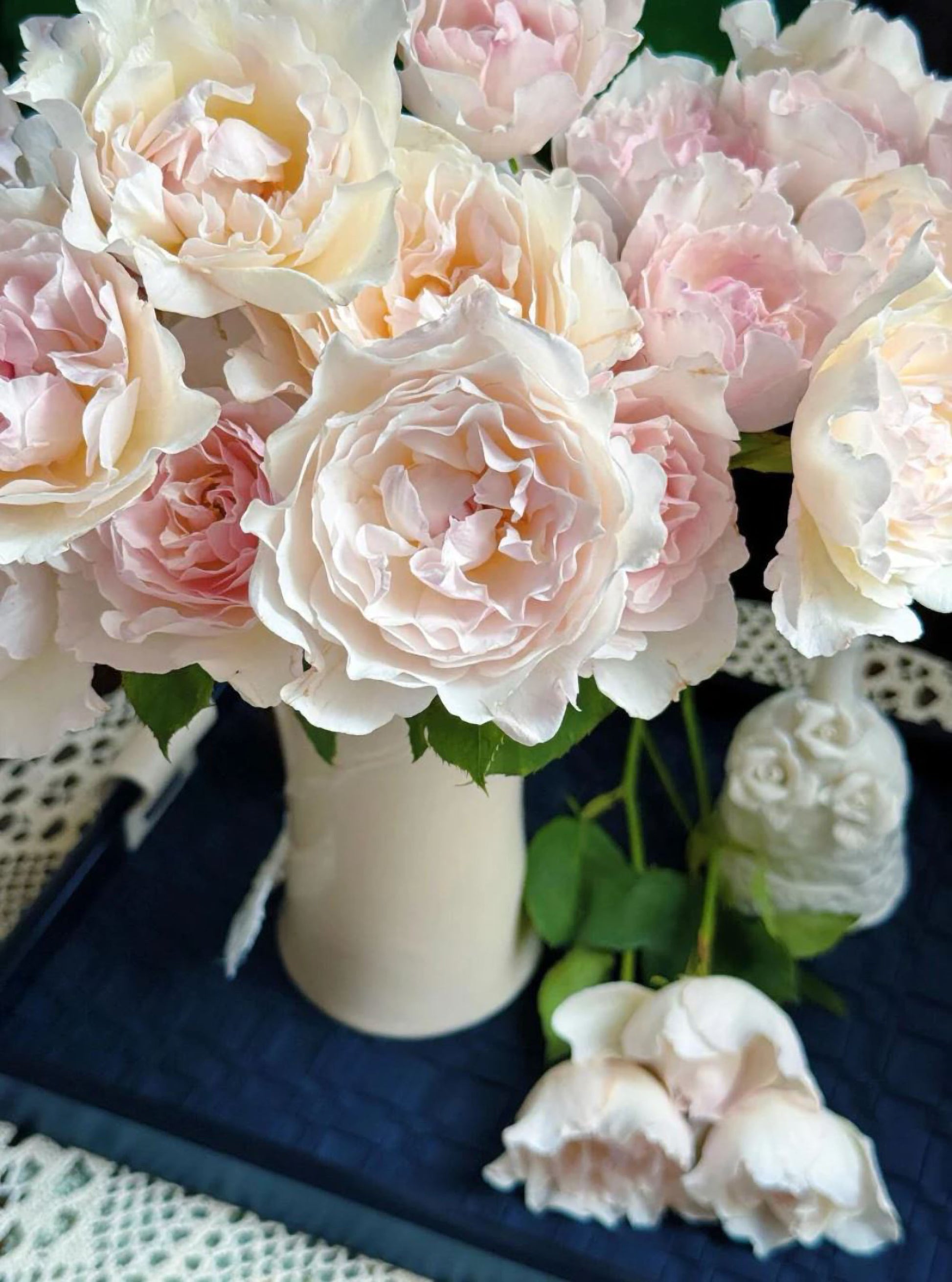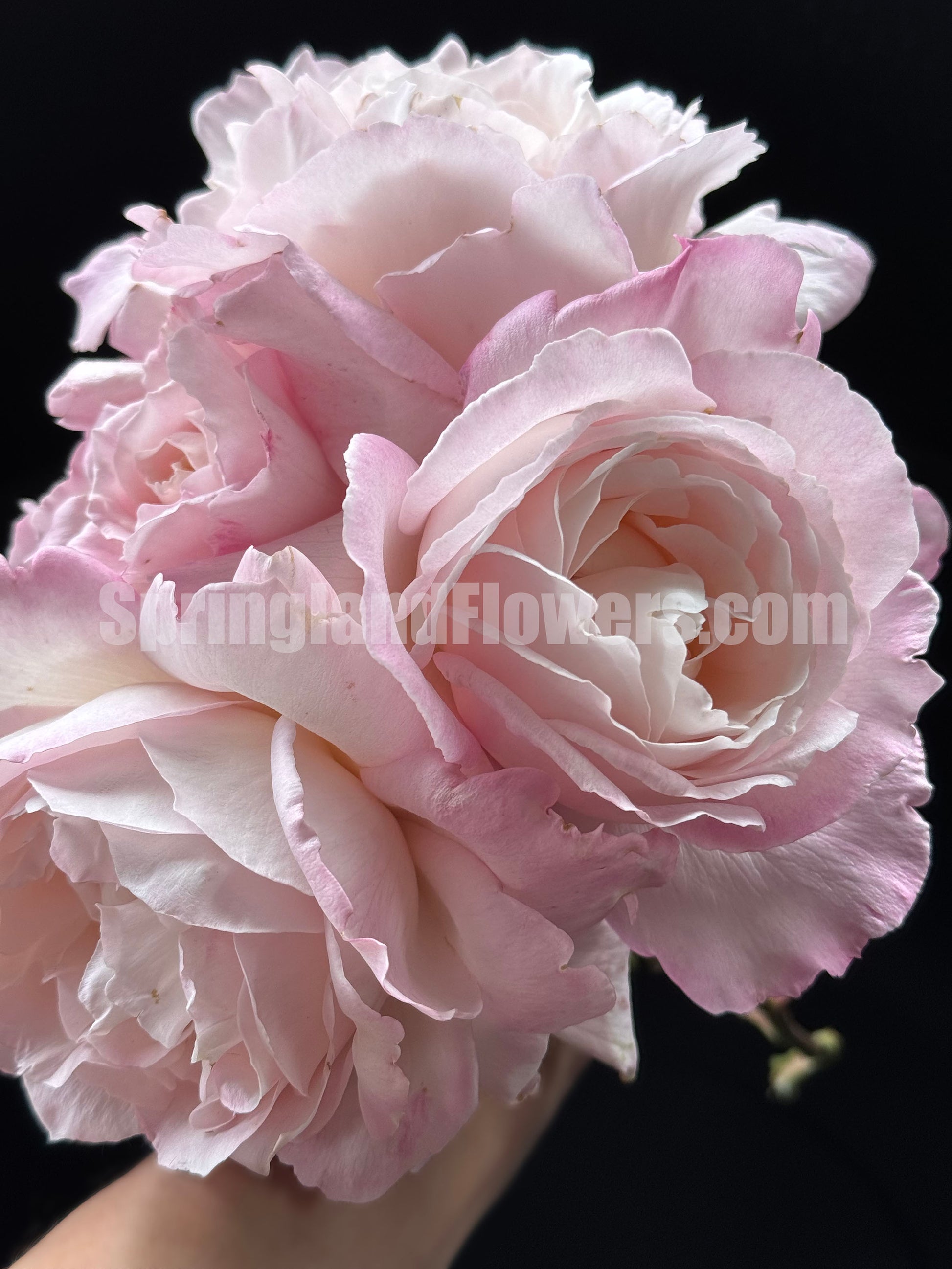 This rose variety features soft, pale pink blooms that gradually fade to white as they open. The blossoms are delicately cupped, with gently unfolding petals that radiate a sense of grace and tenderness. A subtle fruity fragrance lingers around the fully opened flowers.