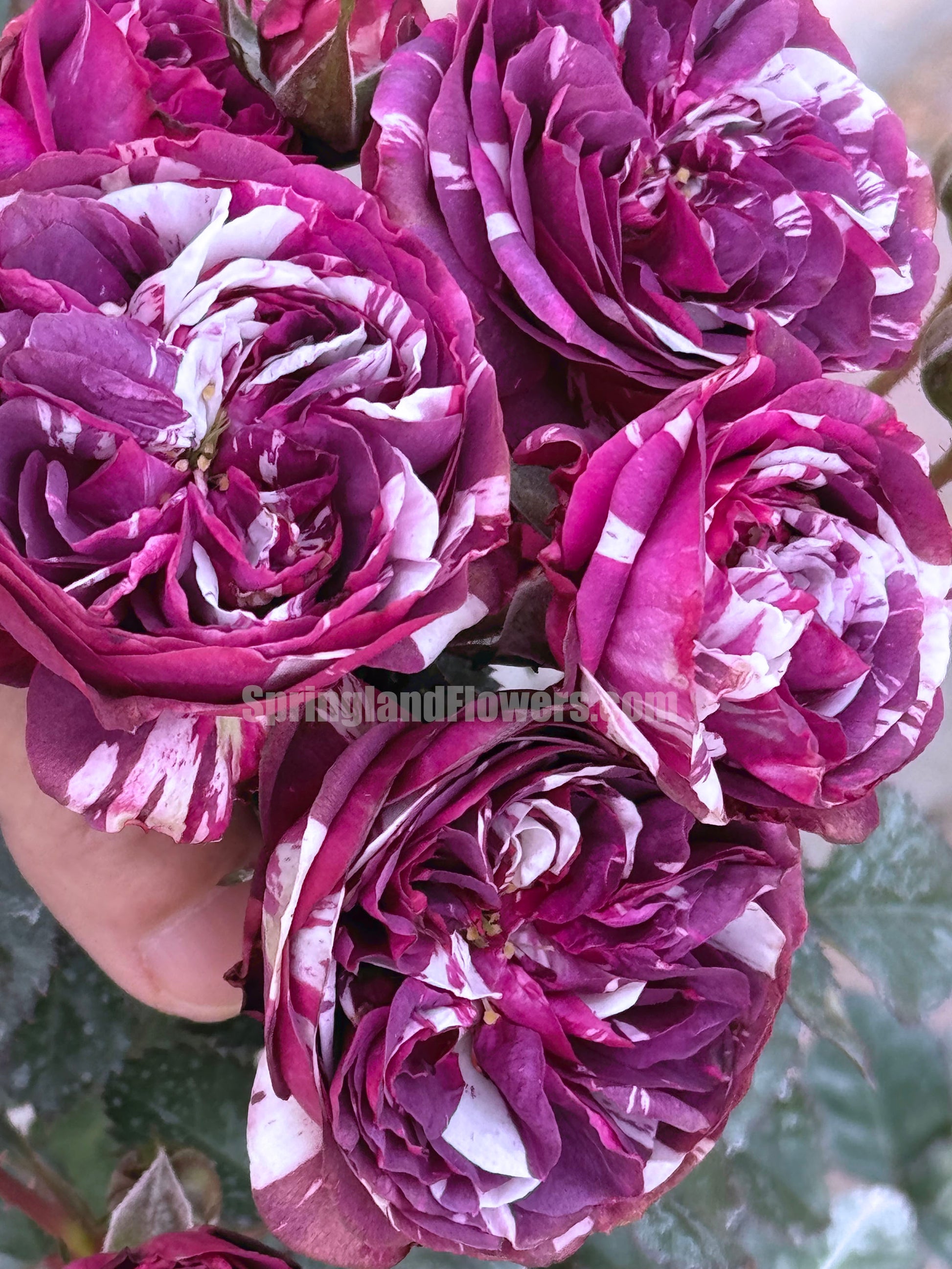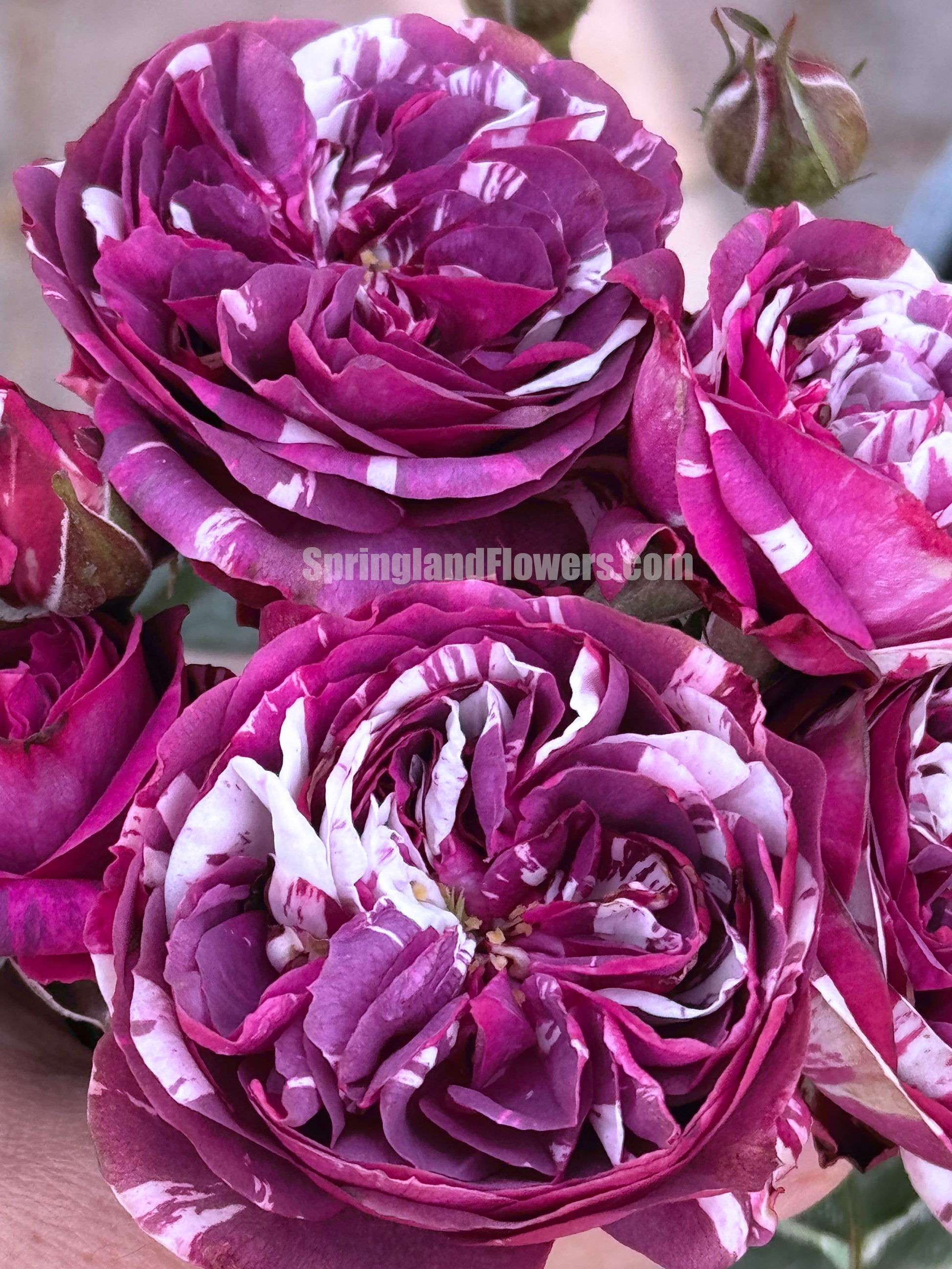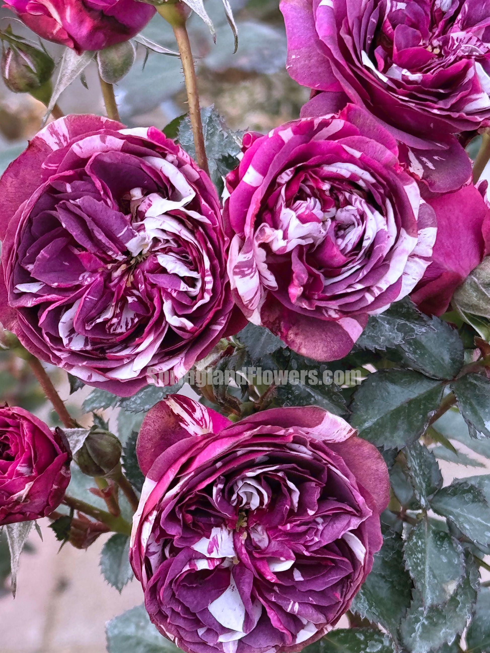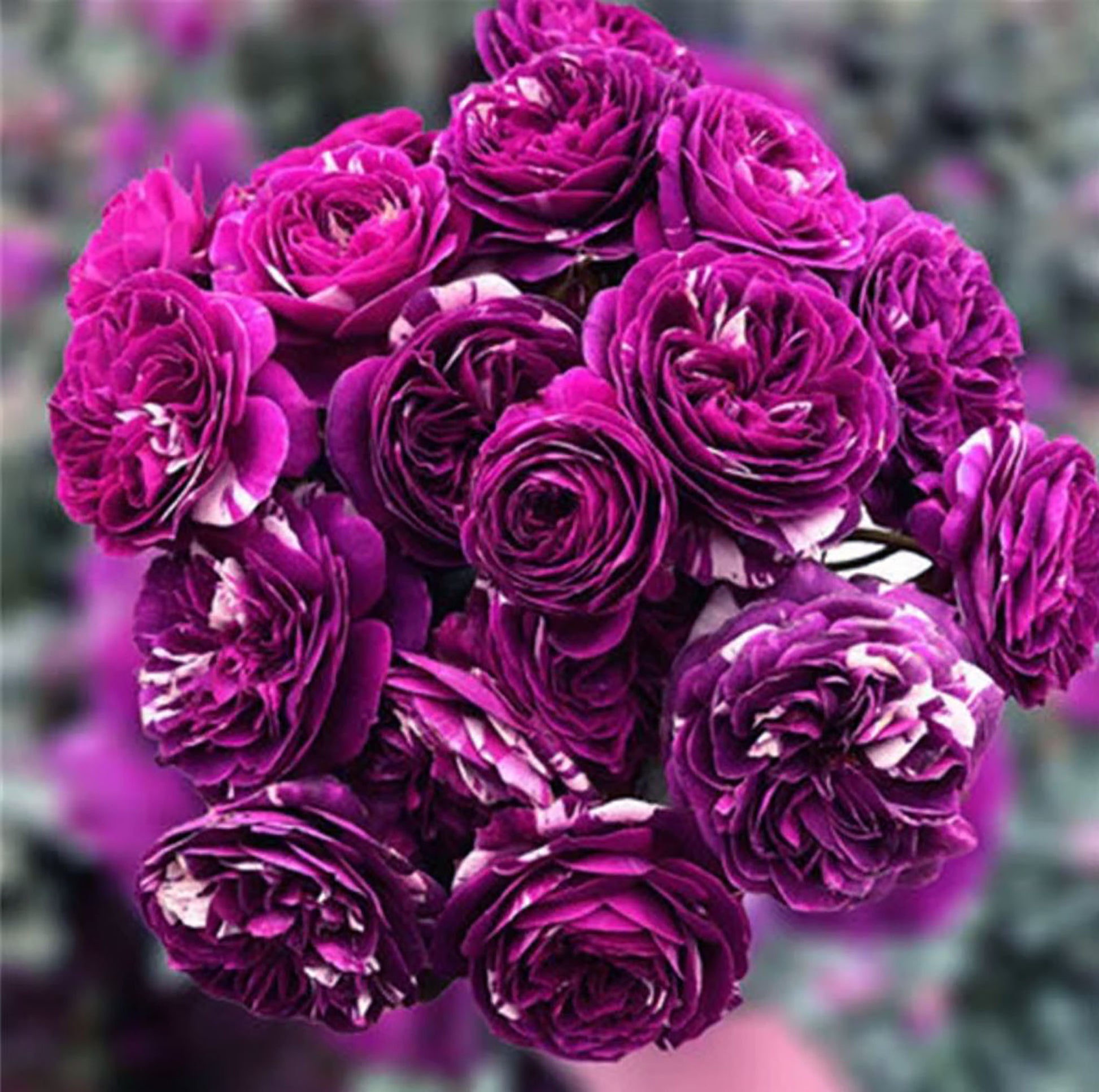 Scented Jewel Rose features flowers with a purple hue and creamy-white stripes, boasting a diameter of 6-8 cm. The blooms exude a classic, old rose fragrance, making it suitable for cutting and arranging. This rose variety exhibits repeated blooming throughout multiple seasons, with multi-headed blossoms that are exceptionally prolific. The plant is known for its frequent flowering, long blooming period, and strong fragrance. With a height ranging from 60 to 80 cm, it is easy to maintain, and when planted in groups, it delivers an impressive floral display.